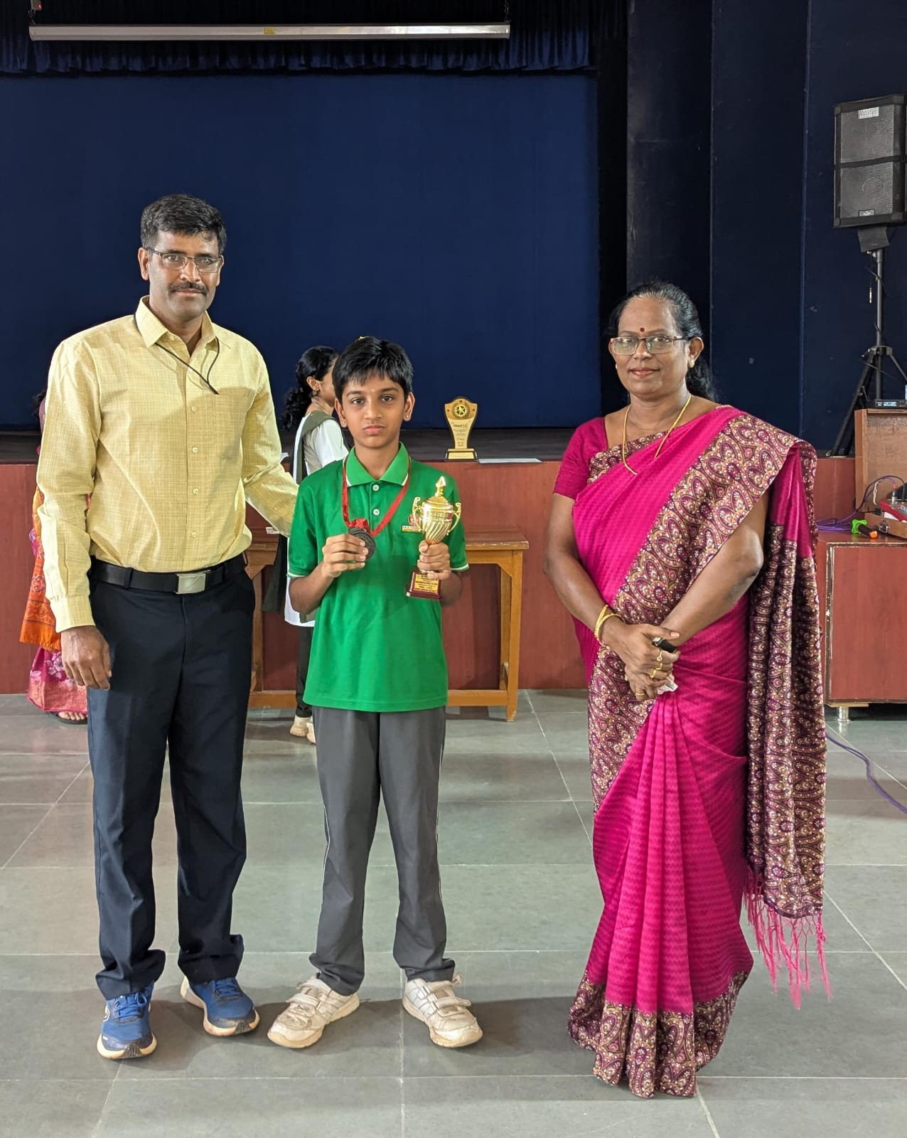 Pranav Mukunth.P of our school participated in the Open Chess Tournament conducted by Kilpauk Chess Tournament held at Bhavan's Rajiji Vidya ashram on the 4th of February 2024.He scored a 4.5 out of 6 and finished at the 9th place in the U-19 boys category. Congratulations to the winner!
